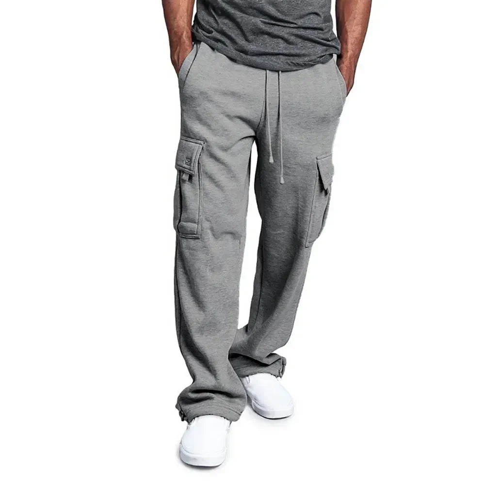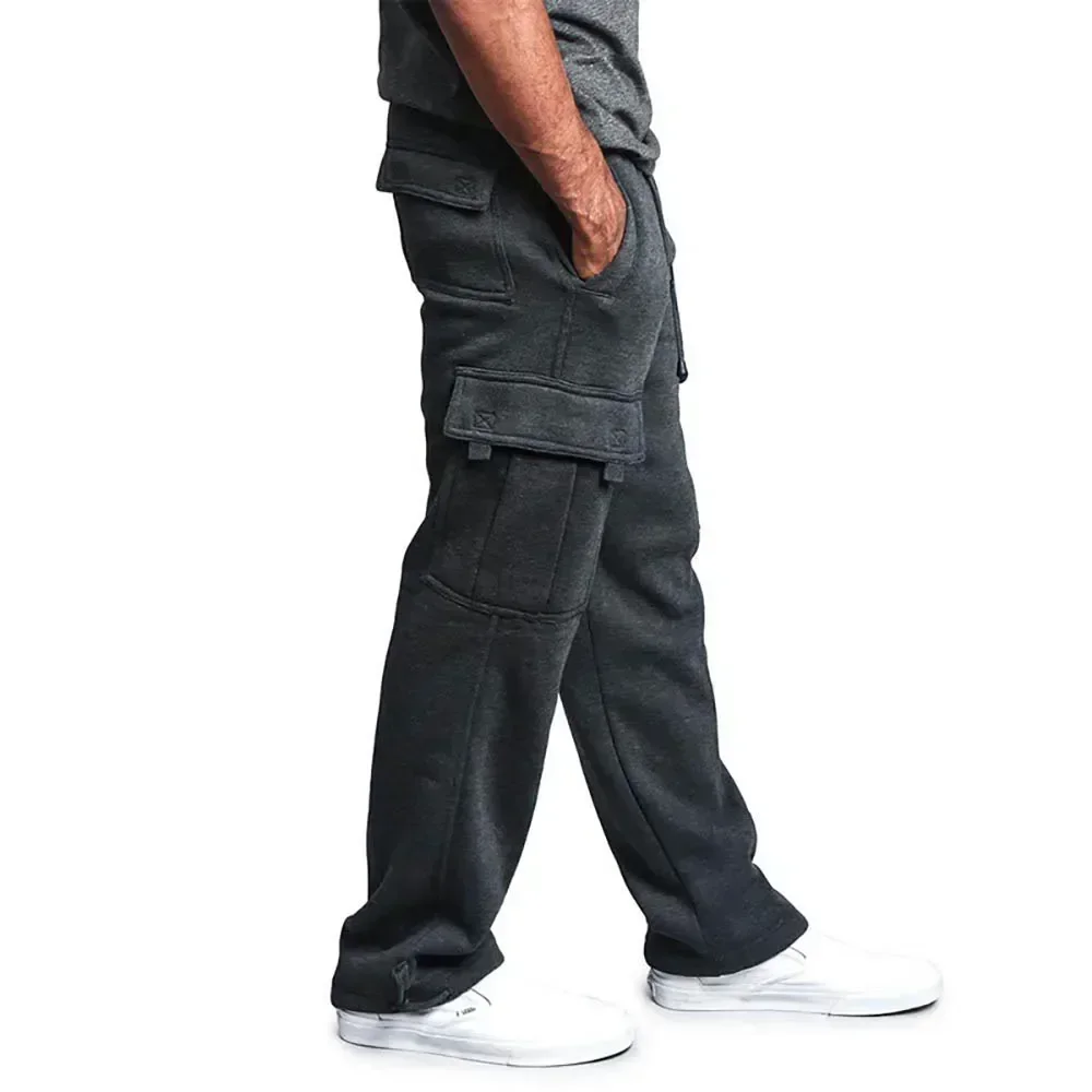 Men's Fleece Cargo Pants Loose Drawstring Sweatpants with Pockets Sports Straight Trousers Jogging Long Pants Hip Hop Streetwear